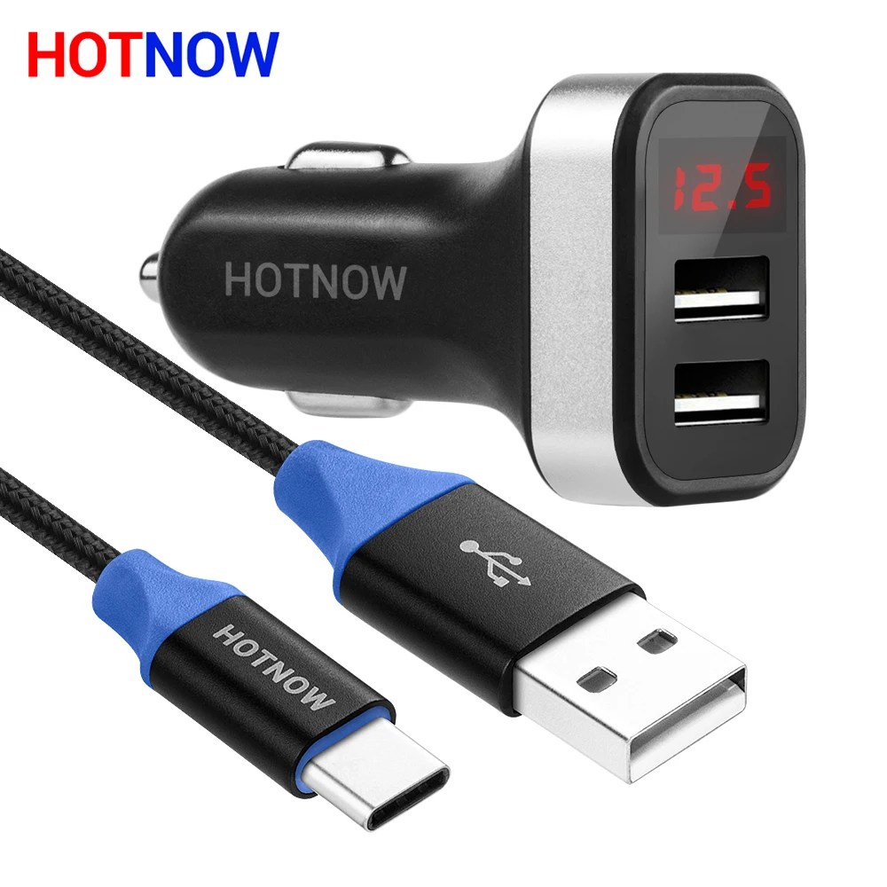 Beste Kopen HOTNOW 5 V 3.1A Autolader met LED Screen Smart Auto auto Oplader Adapter Type C kabel Opladen voor iPhone 7 Samsung Xiaomi Goedkoop